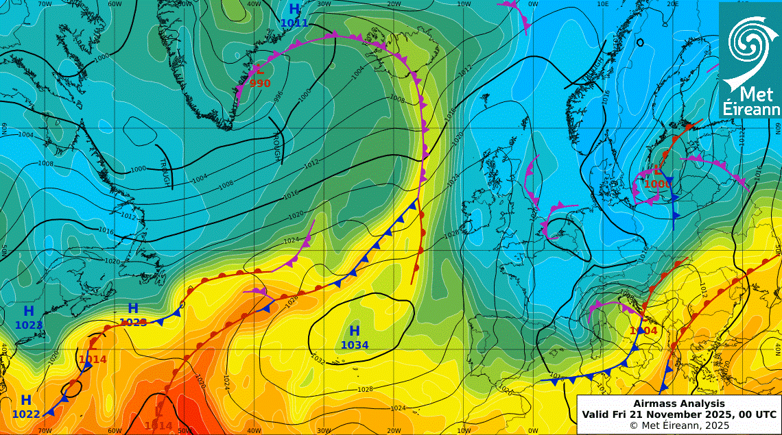 Синоптичка ситуација 21.11.2025. На слици се види приближавање циклона и фронталне зоне из Јадрана као и прилив хладнијег ваздуха до северозапада Балкана. (извор: Met Éireann)