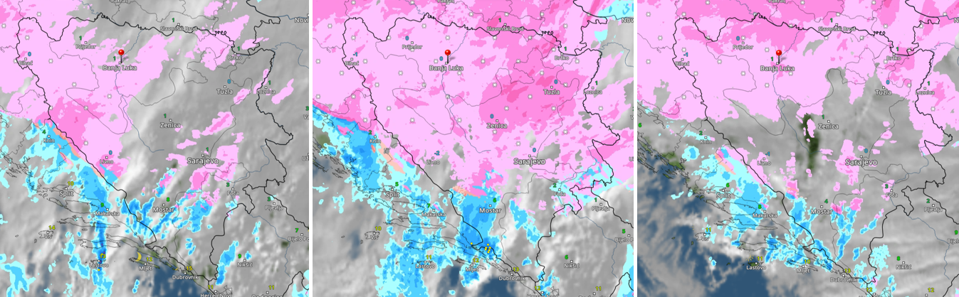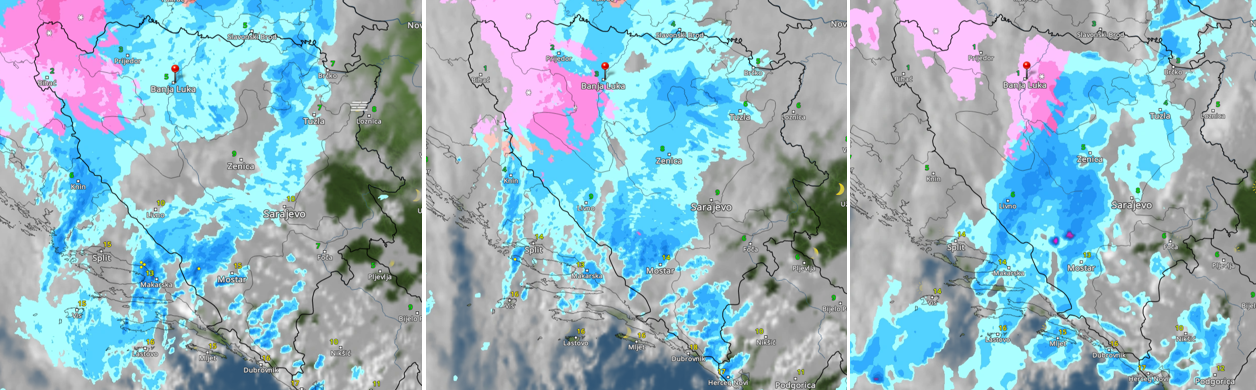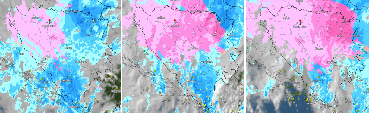 Сателиска слика облачности и падавина 21.11. у 13, 17 и 19 часова: плаво киша, розе снег (извор: wetteronline.de)