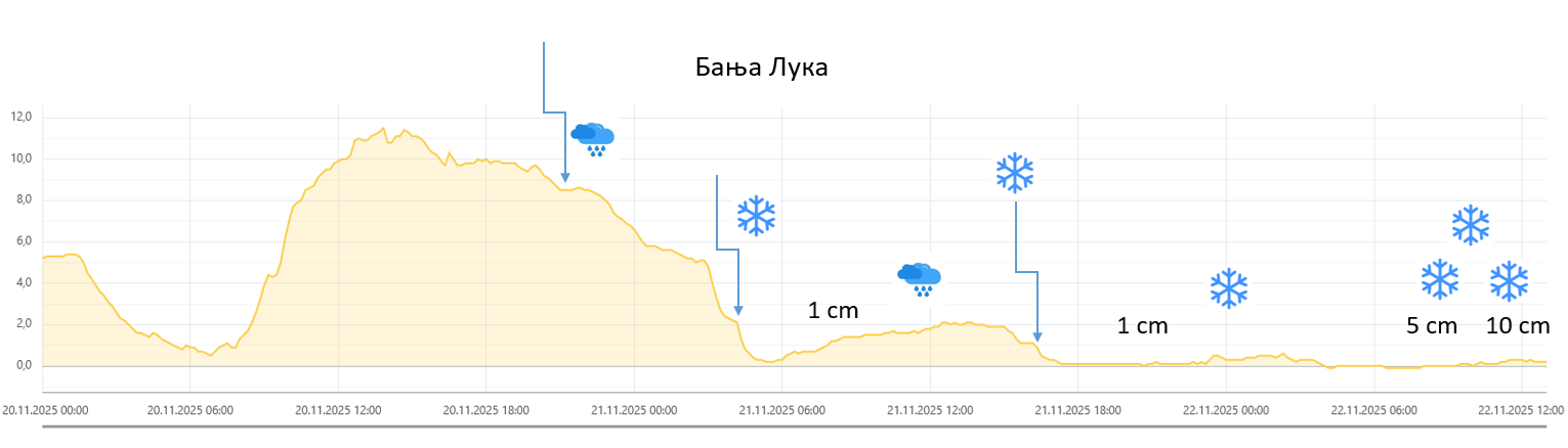 На слици испод је приказан ход температуре за 20-22.11. у Бањалуци као и време појаве снежних падавина, време формирања снежног покривача и висина снежног покривача.