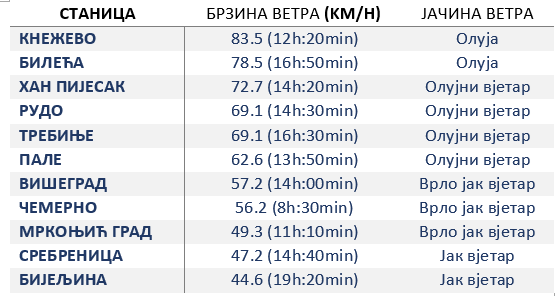У табели су приказани максимални удари ветра и време појаве. Олујни удари ветра на западу су регистовани преподне, а на југу и истоку поподне (како се фронтална зона премештала од запада ка истоку):