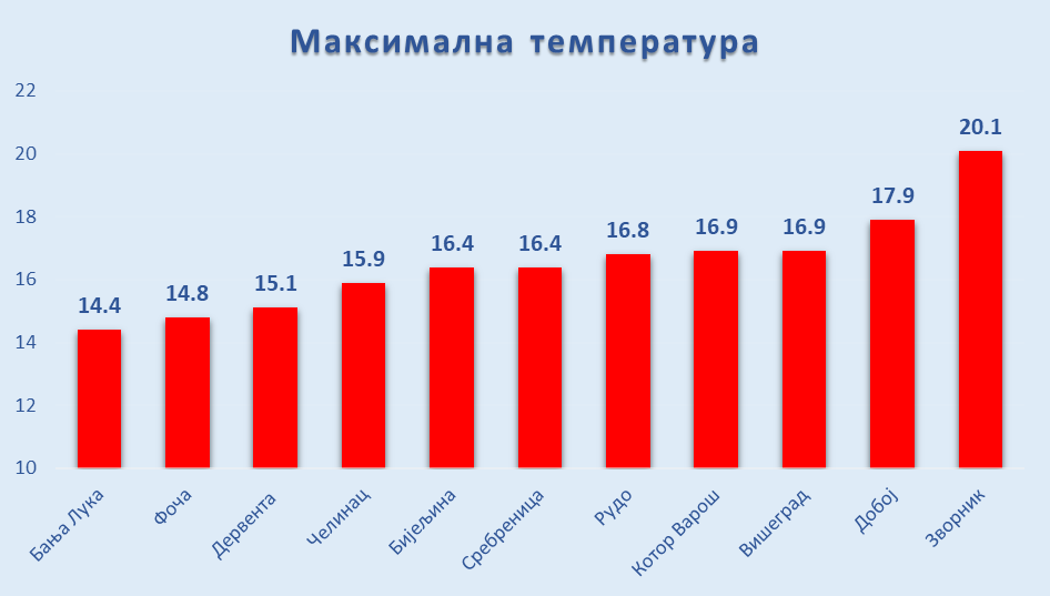 У исто време на северу и истоку је било сунчаније и врло топло. Најтоплији је био Зворник уз максималну температуру од чак 20.1°С.