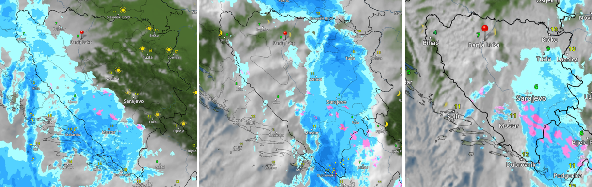 Сателитска слика облачности и падавина у 13, 17 и 23 часа: плаво киша, розе: снег. (Извор: wetteronline.de)
